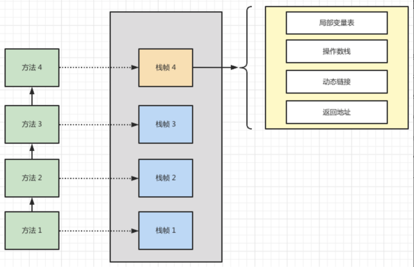 (栈帧:一个方法就是一个栈帧,栈只有入栈和出栈两种操作):