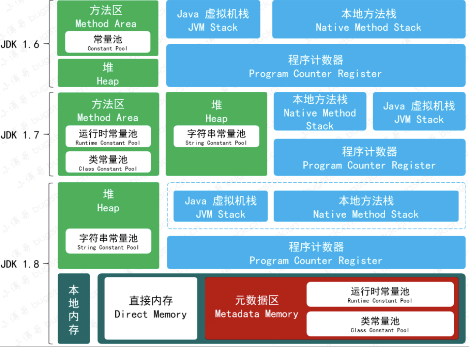 但随着jdk各版本的发布,运行时数据区的结构会各有差异,可参见下图: