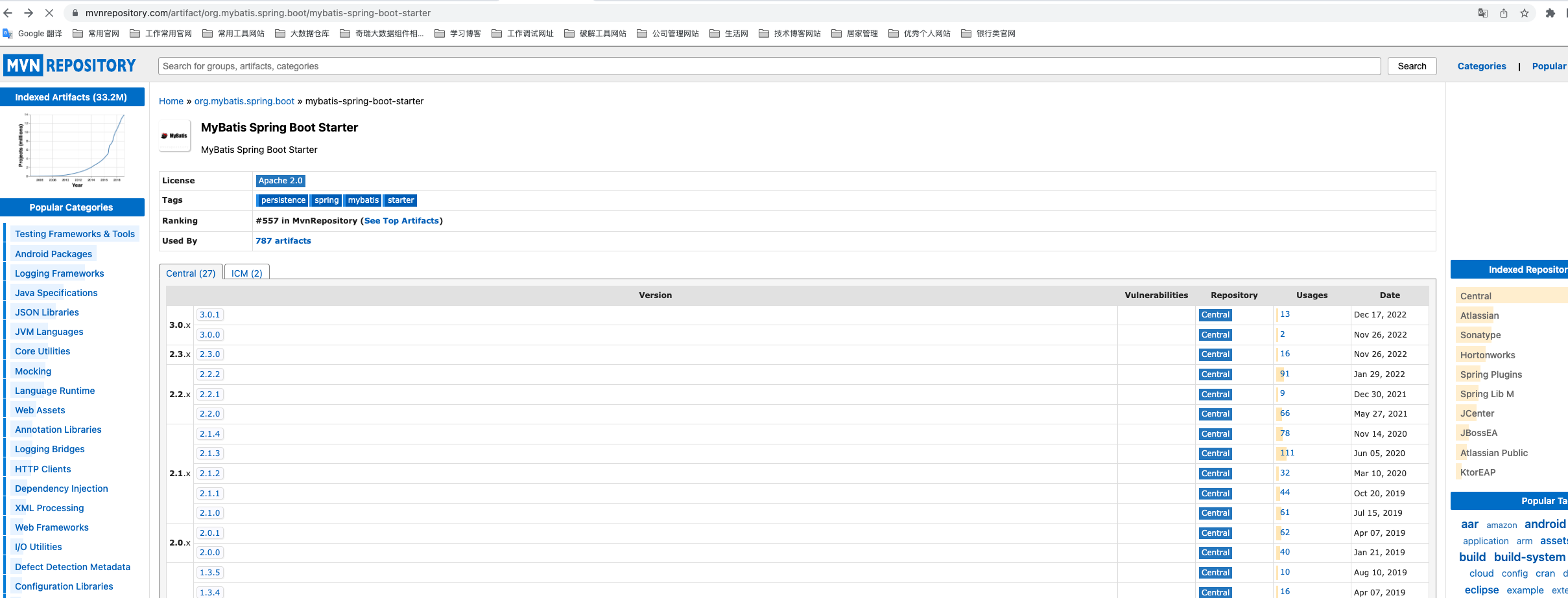 从mvn repo官网查看mybatis-spring-boot-starter对应的各版本号,如图:
