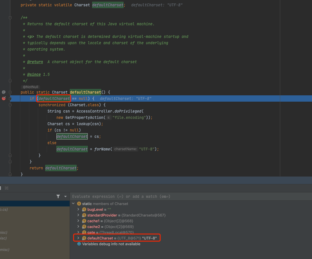 /** * Returns the default charset of this Java virtual machine. * 返回此 Java 虚拟机的默认字符集。 * <p> The default charset is determined during virtual-machine startup and * typically depends upon the locale and charset of the underlying * operating system. * 默认字符集在虚拟机启动期间确定,通常取决于底层操作系统的区域设置和字符集。 * @return A charset object for the default charset * * @since 1.5 */ publicstatic Charset defaultCharset() { if (defaultCharset == null) { synchronized (Charset.class) { Stringcsn= AccessController.doPrivileged( newGetPropertyAction("file.encoding")); Charsetcs= lookup(csn); if (cs != null) defaultCharset = cs; else defaultCharset = forName("UTF-8"); } } return defaultCharset; }