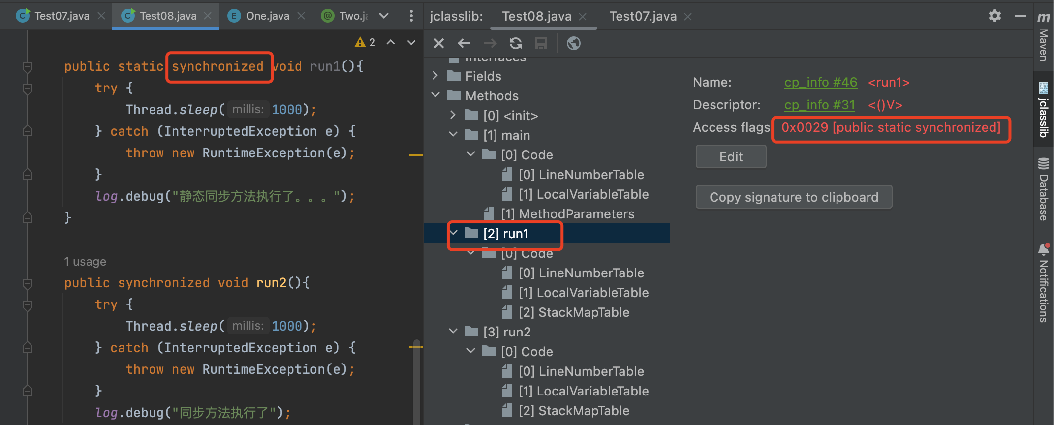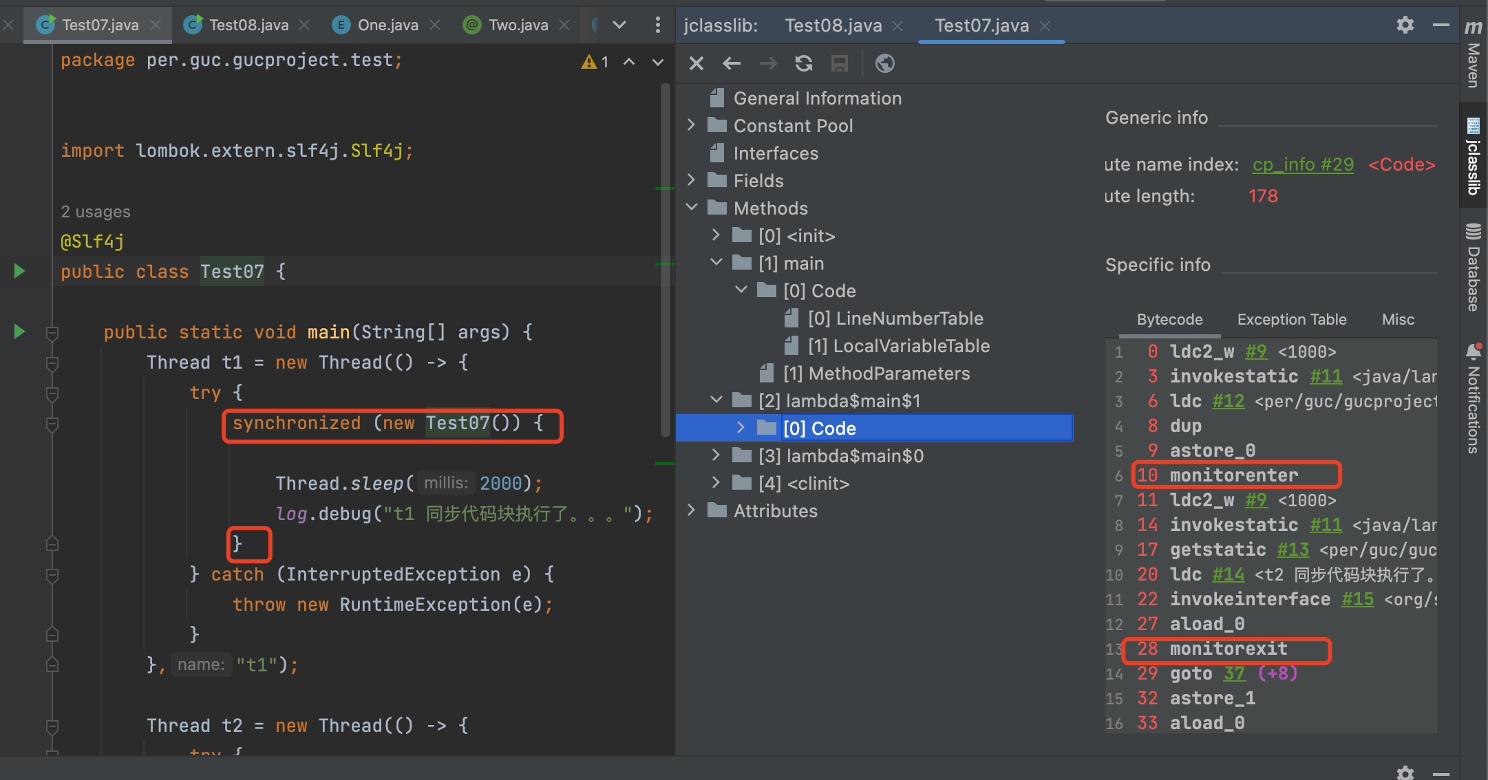 1.在代码块里面修饰对应的就是monitorenter和monitorexit分别为获取对象锁和释放对象锁,如图: