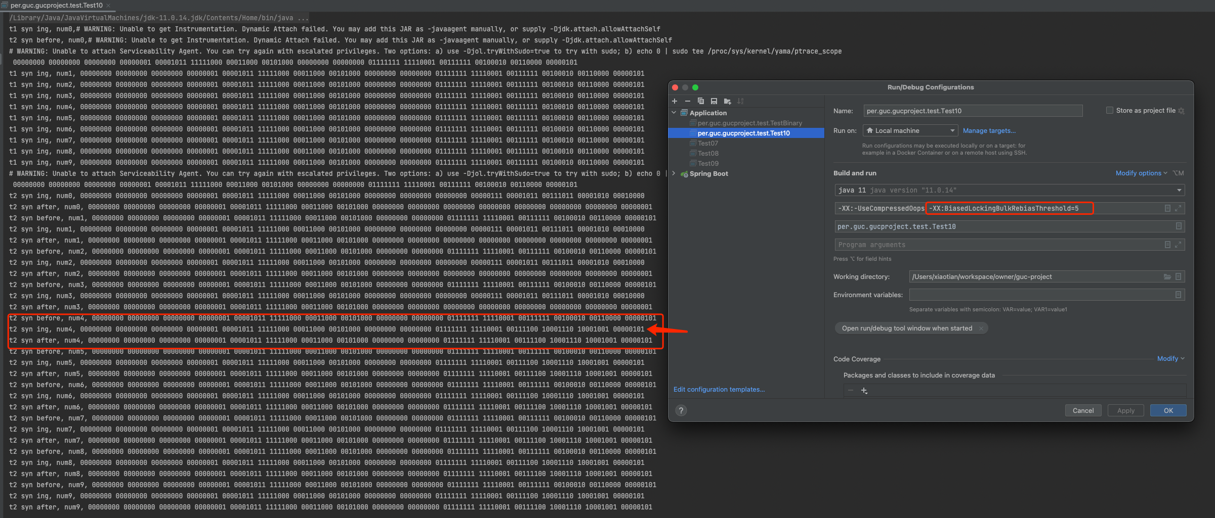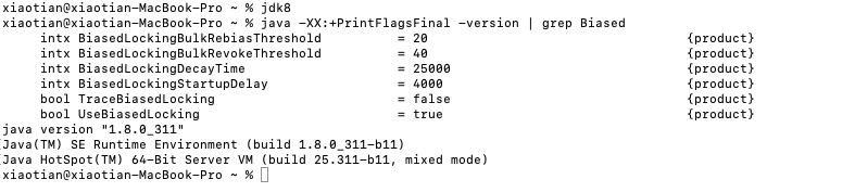 可使用 java -XX:+PrintFlagsFinal -version |grep Biased 查看JVM相关偏向锁的默认配置,如图: