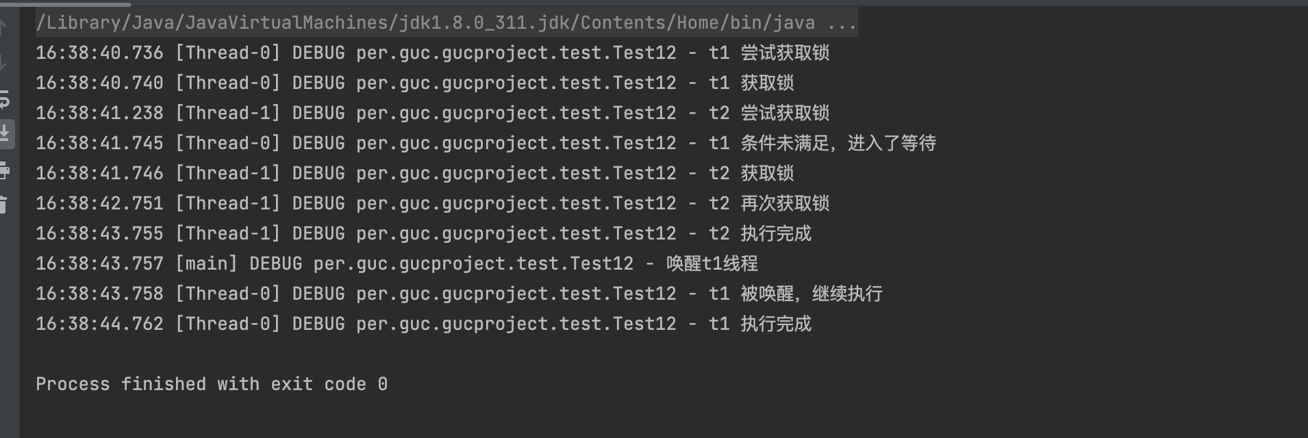 t1.start(); try { Thread.sleep(500); } catch (InterruptedException e) { throw new RuntimeException(e); } t2.start(); try { t2.join(); } catch (InterruptedException e) { throw new RuntimeException(e); } log.debug("唤醒t1线程"); synchronized (lock) { lock.notify(); } } }