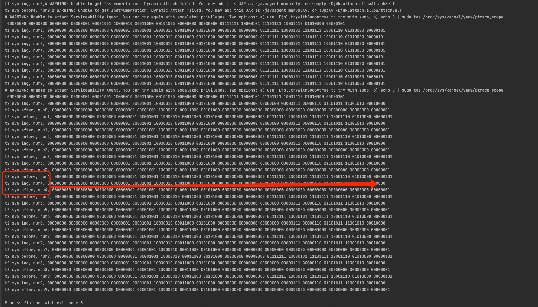 该参数为默认对象锁批量重偏向和批量重撤销偏向的统计间隔时间,超过则会清零重新统计,默认阈值为25秒,每个线程的间隔时间会休眠4秒,线程3每个工作任务的间隔为0.24秒,批量重偏向的阈值为6,批量撤销偏向锁为10,所以将间隔时间调整成6秒(-XX:BiasedLockingDecayTime=6000),执行结果如图: