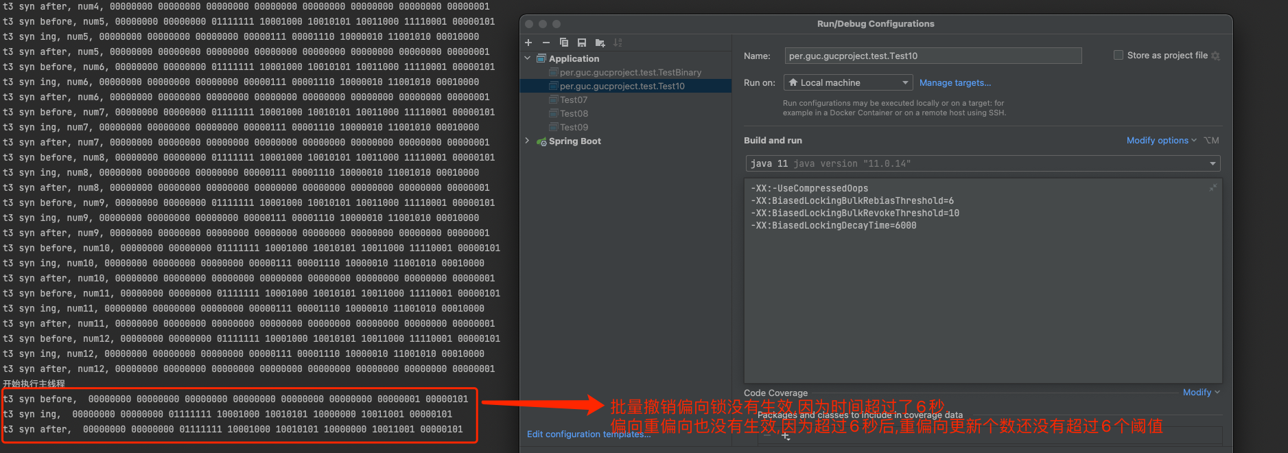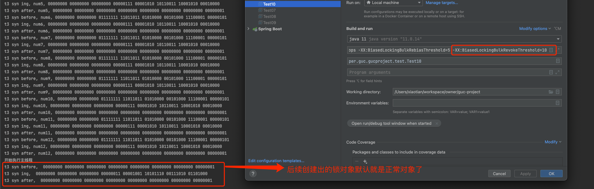 阈值未调整前,主线程创建的对象还是未默认偏向锁的对象(因为阈值为40),现在测试类中二次批量重偏向只跑了11次,如图: