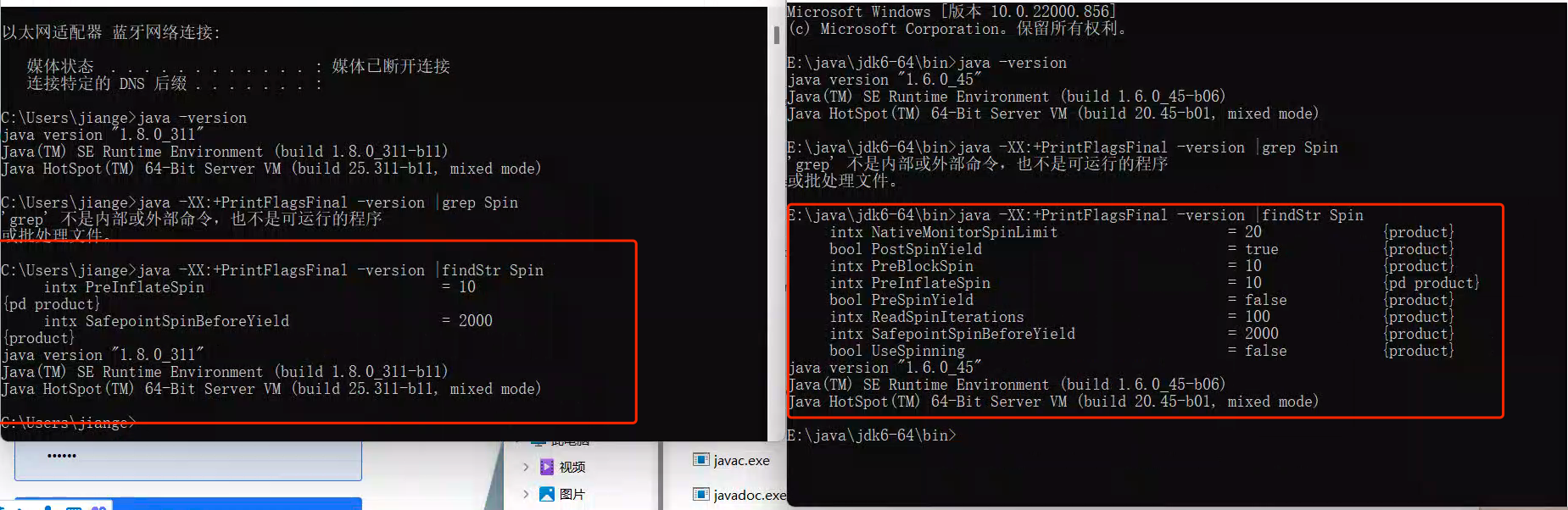 jdk8和jdk6对应默认参数的配置情况,通过java -XX:+PrintFlagsFinal -version | findStr Spin指令进行查看,如图: