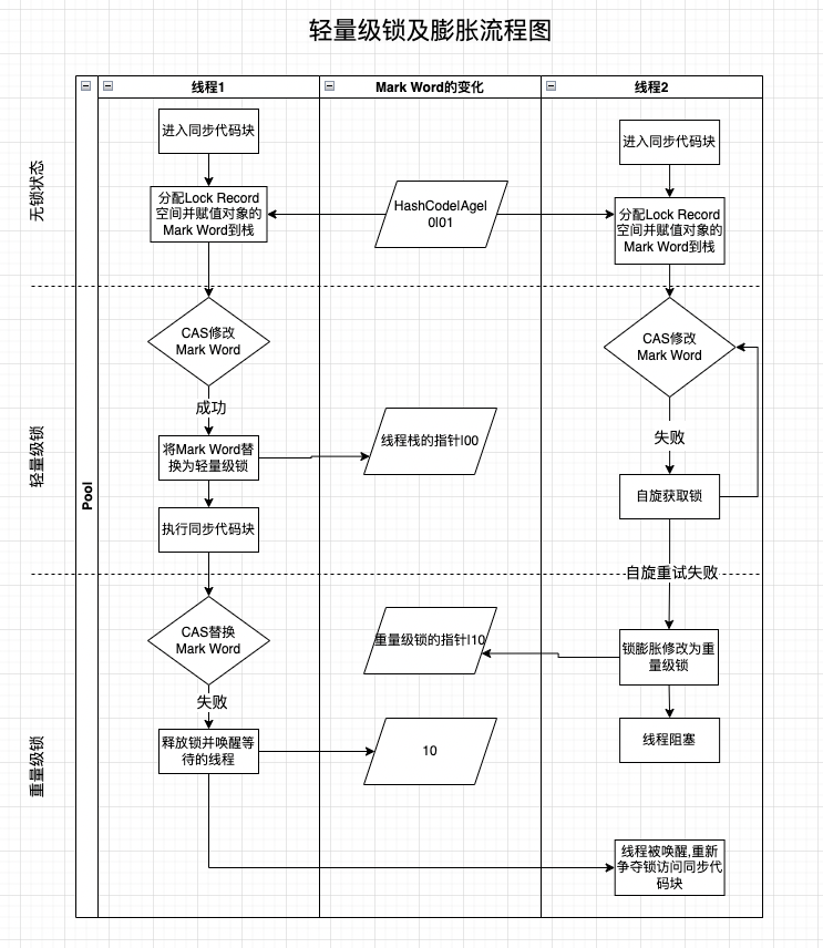 | -- 场景: 当JVM关闭偏向锁(默认是开启的,采用-XX:-UseBiasedLocking)功能或者多个线程竞争偏向锁导致偏向锁升级为轻量级锁,则会尝试获取轻量级锁. ## 获取锁步骤 1.判断当前对象是否处于无锁状态(hashcode、0、01),若是则JVM首先将在当前线程的栈帧中建立一个名为锁记录(Lock Record)的空间,用于存储锁对象目前的Mark Word的拷贝(官方把这份拷贝加了一个Displaced前缀,即Displaced Mark Word);否则执行步骤3 2.JVM利用CAS操作尝试将对象的Mark Word更新位指向Lock Record的指针,如果成功表示竞争到锁,则将锁标志位变成00(表示该对象处于轻量级锁状态),执行同步操作;如果失败则执行步骤3 3.判断当前对象的Mark Word是否指向当前线程的栈帧,如果是则表示当前线程已经持有当前对象的锁,则直接执行同步代码块;否则只能说明该锁对象已经被其他线程抢占了,这时轻量级锁需要膨胀位重量级锁,锁标志位变成10,后面等待的线程将会进入阻塞状态 ## 释放锁 1.取出在获取轻量级锁保存在Displaced Mark Word中的数据; 2.用CAS操作将取出的数据替换当前对象的Mark Word中,如果成功,则说明释放锁成功,否则执行3; 3.如果CAS操作替换失败,说明有其他线程尝试获取该锁,则需要在释放锁的同时需要唤醒被挂起的线程.
