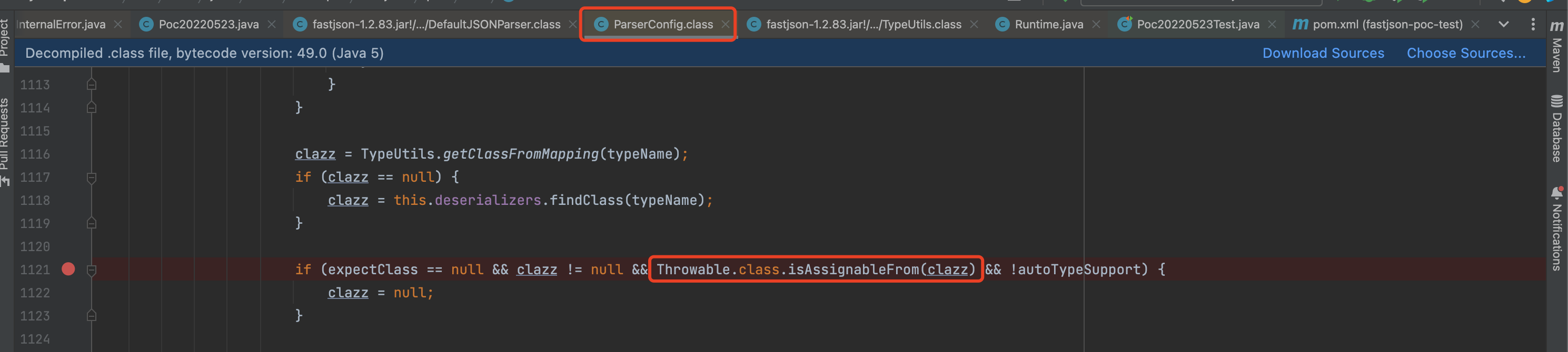 | ParseConfig.class类 第1121行 将excepiton加载完成的类重新赋值为空,这样解析Poc20220523这个序列化类的时候expectClass就为null了,从而阻止了Poc20220523类autoType的绕过