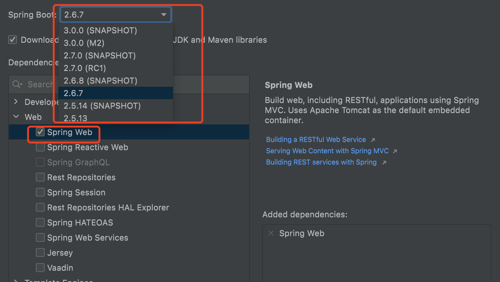 2.官方维护版本只有2.6.7和2.5.13了,创建完成之后在修改成老版本,勾选spring web框架