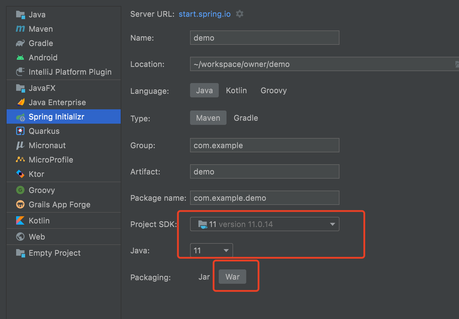 1.用IDE创建一个springboot的项目,jdk版本为11,选用war的方式。