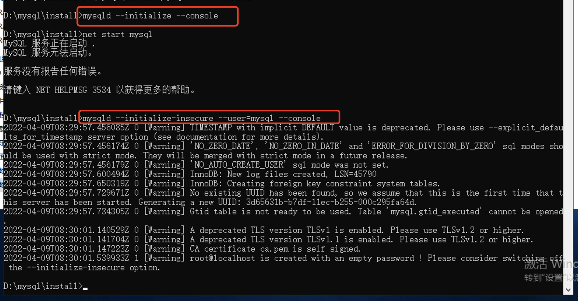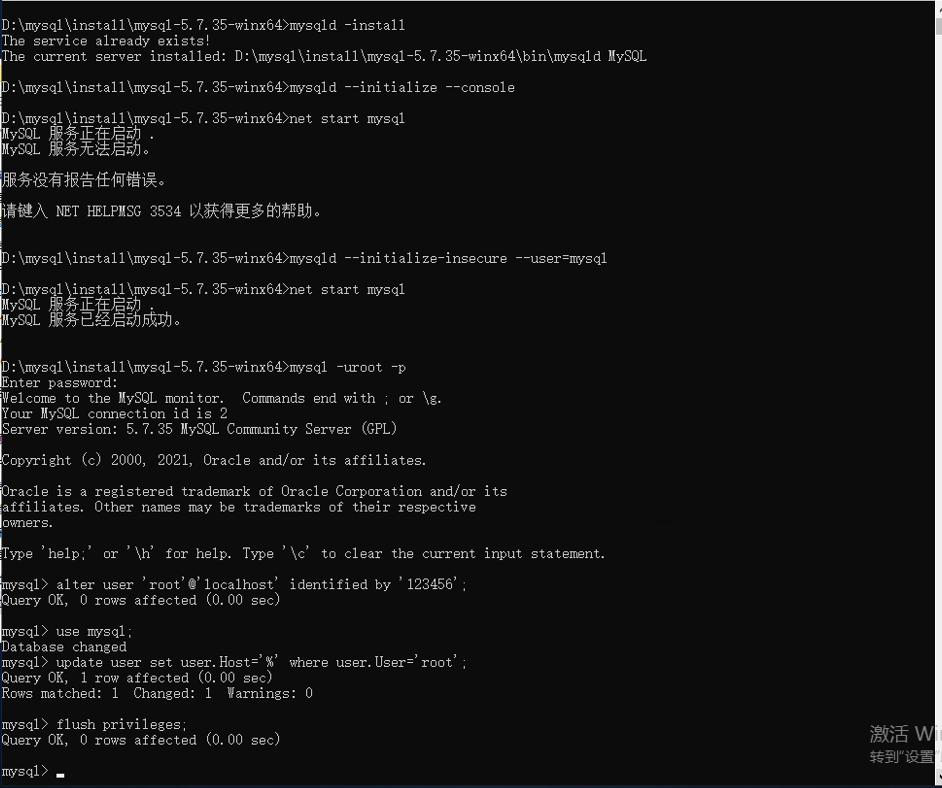 net start mysql启动服务