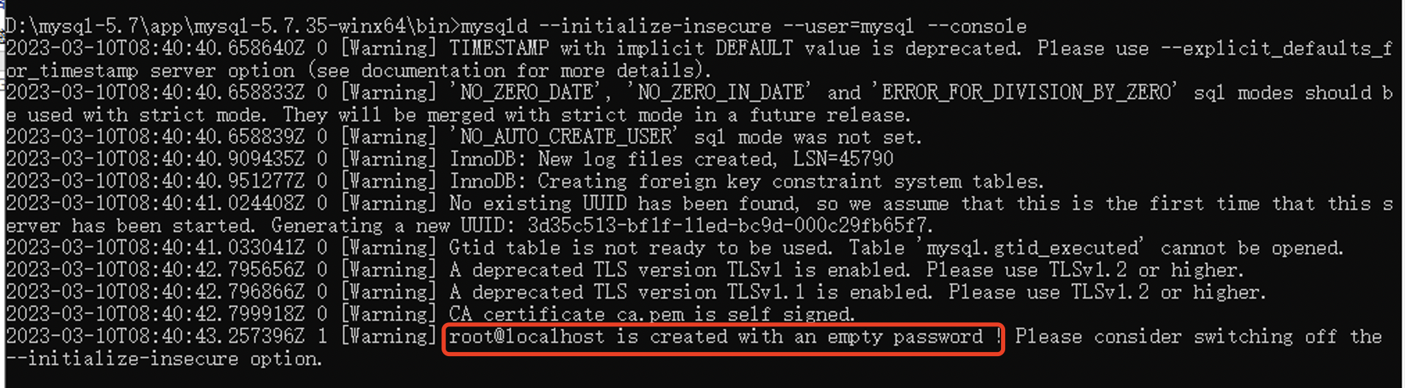 1.执行mysql初始化命令: mysqld –initialize-insecure –user=mysql –console