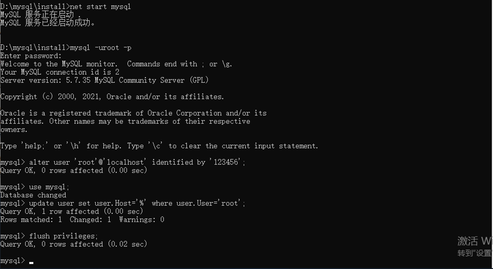 3.执行启动mysql服务命令: net start mysql