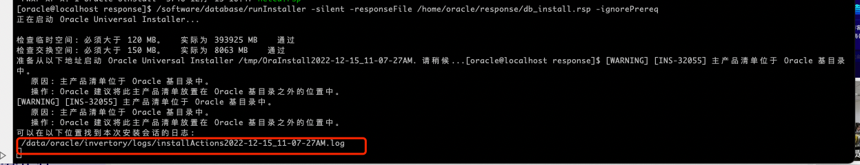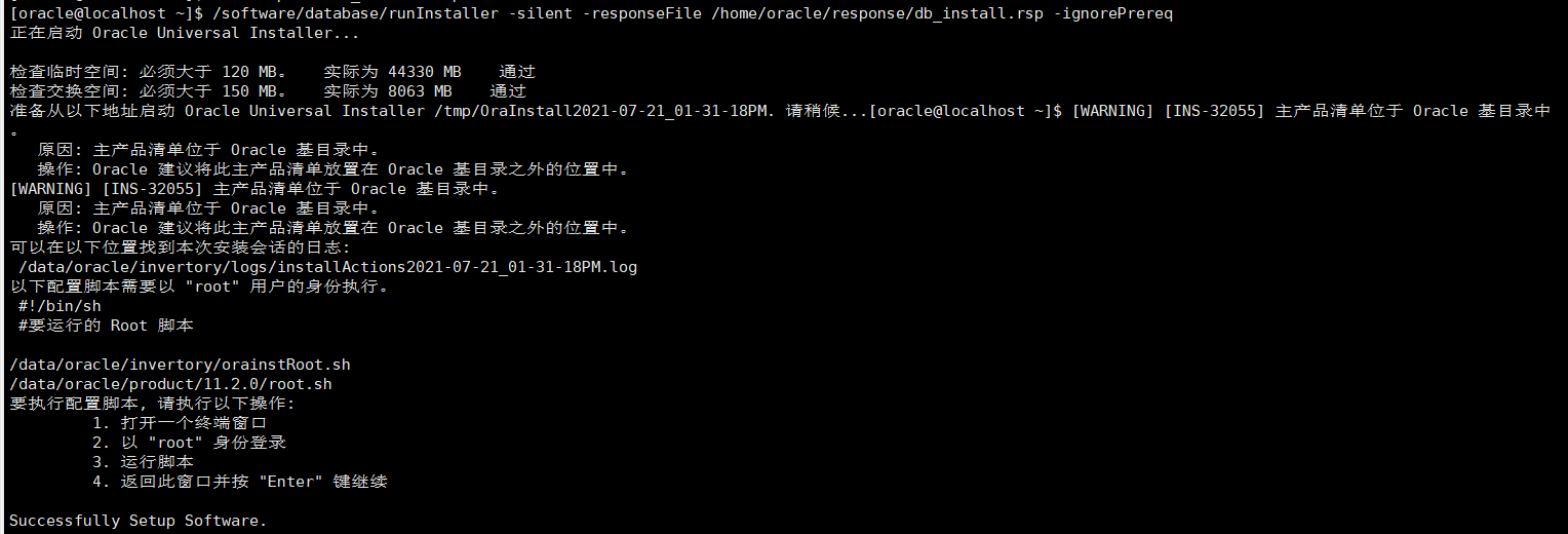 /software/database/runInstaller -silent -responseFile /home/oracle/response/db_install.rsp -ignorePrereq
