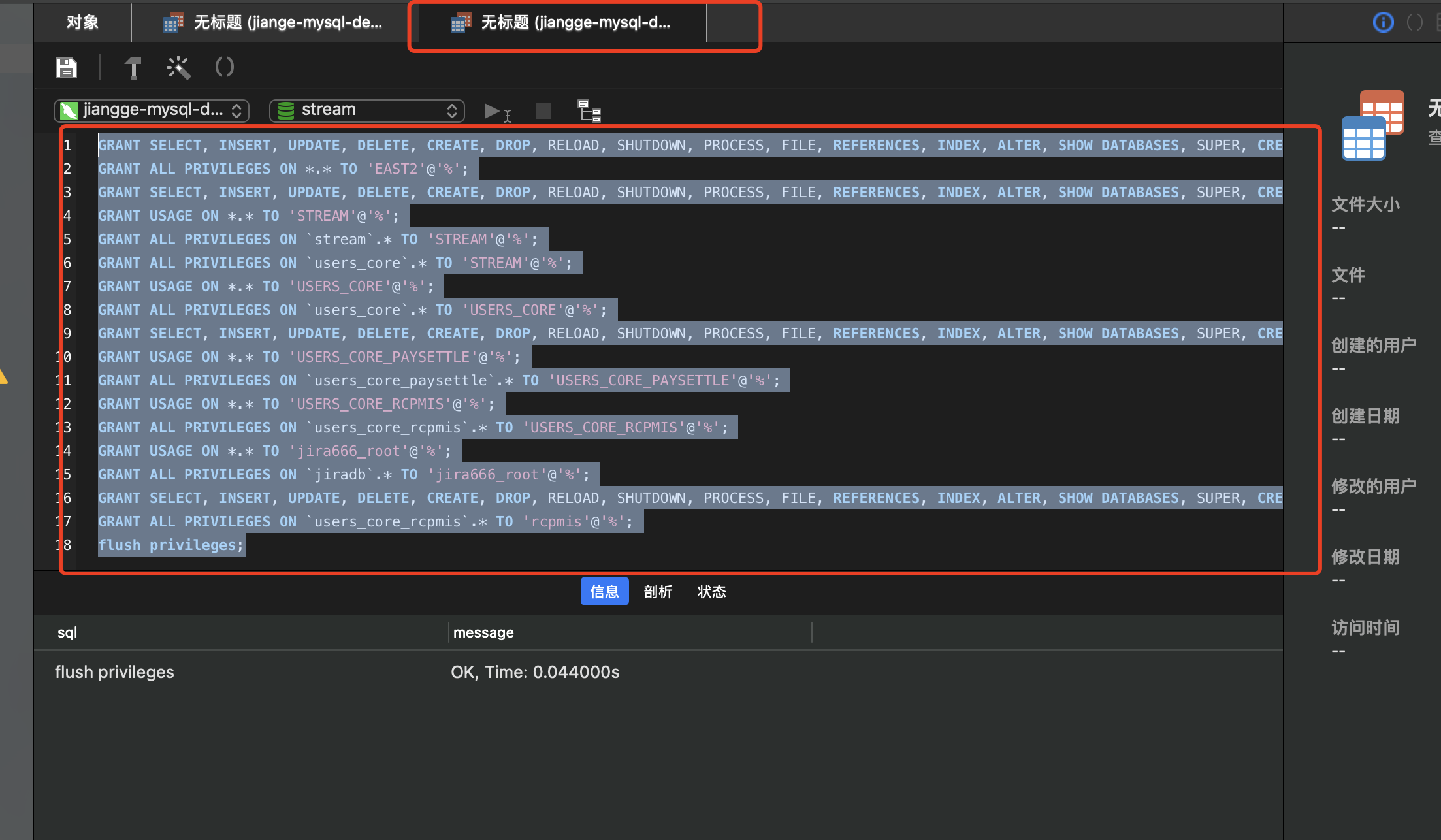 GRANT SELECT, INSERT, UPDATE, DELETE, CREATE, DROP, RELOAD, SHUTDOWN, PROCESS, FILE, REFERENCES, INDEX, ALTER, SHOW DATABASES, SUPER, CREATE TEMPORARY TABLES, LOCK TABLES, EXECUTE, REPLICATION SLAVE, REPLICATION CLIENT, CREATE VIEW, SHOW VIEW, CREATE ROUTINE, ALTER ROUTINE, CREATE USER, EVENT, TRIGGER ON *.* TO 'COMMON_IMPORT_IMAS'@'%' WITH GRANT OPTION; GRANT ALL PRIVILEGES ON *.* TO 'EAST2'@'%'; GRANT SELECT, INSERT, UPDATE, DELETE, CREATE, DROP, RELOAD, SHUTDOWN, PROCESS, FILE, REFERENCES, INDEX, ALTER, SHOW DATABASES, SUPER, CREATE TEMPORARY TABLES, LOCK TABLES, EXECUTE, REPLICATION SLAVE, REPLICATION CLIENT, CREATE VIEW, SHOW VIEW, CREATE ROUTINE, ALTER ROUTINE, CREATE USER, EVENT, TRIGGER ON *.* TO 'RATE_FILING'@'%' WITH GRANT OPTION; GRANT USAGE ON *.* TO 'STREAM'@'%'; GRANT ALL PRIVILEGES ON `stream`.* TO 'STREAM'@'%'; GRANT ALL PRIVILEGES ON `users_core`.* TO 'STREAM'@'%'; GRANT USAGE ON *.* TO 'USERS_CORE'@'%'; GRANT ALL PRIVILEGES ON `users_core`.* TO 'USERS_CORE'@'%'; GRANT SELECT, INSERT, UPDATE, DELETE, CREATE, DROP, RELOAD, SHUTDOWN, PROCESS, FILE, REFERENCES, INDEX, ALTER, SHOW DATABASES, SUPER, CREATE TEMPORARY TABLES, LOCK TABLES, EXECUTE, REPLICATION SLAVE, REPLICATION CLIENT, CREATE VIEW, SHOW VIEW, CREATE ROUTINE, ALTER ROUTINE, CREATE USER, EVENT, TRIGGER ON *.* TO 'USERS_CORE_IMAS'@'%' WITH GRANT OPTION; GRANT USAGE ON *.* TO 'USERS_CORE_PAYSETTLE'@'%'; GRANT ALL PRIVILEGES ON `users_core_paysettle`.* TO 'USERS_CORE_PAYSETTLE'@'%'; GRANT USAGE ON *.* TO 'USERS_CORE_RCPMIS'@'%'; GRANT ALL PRIVILEGES ON `users_core_rcpmis`.* TO 'USERS_CORE_RCPMIS'@'%'; GRANT USAGE ON *.* TO 'jira666_root'@'%'; GRANT ALL PRIVILEGES ON `jiradb`.* TO 'jira666_root'@'%'; GRANT SELECT, INSERT, UPDATE, DELETE, CREATE, DROP, RELOAD, SHUTDOWN, PROCESS, FILE, REFERENCES, INDEX, ALTER, SHOW DATABASES, SUPER, CREATE TEMPORARY TABLES, LOCK TABLES, EXECUTE, REPLICATION SLAVE, REPLICATION CLIENT, CREATE VIEW, SHOW VIEW, CREATE ROUTINE, ALTER ROUTINE, CREATE USER, EVENT, TRIGGER ON *.* TO 'rcpmis'@'%' WITH GRANT OPTION; GRANT ALL PRIVILEGES ON `users_core_rcpmis`.* TO 'rcpmis'@'%'; flush privileges;