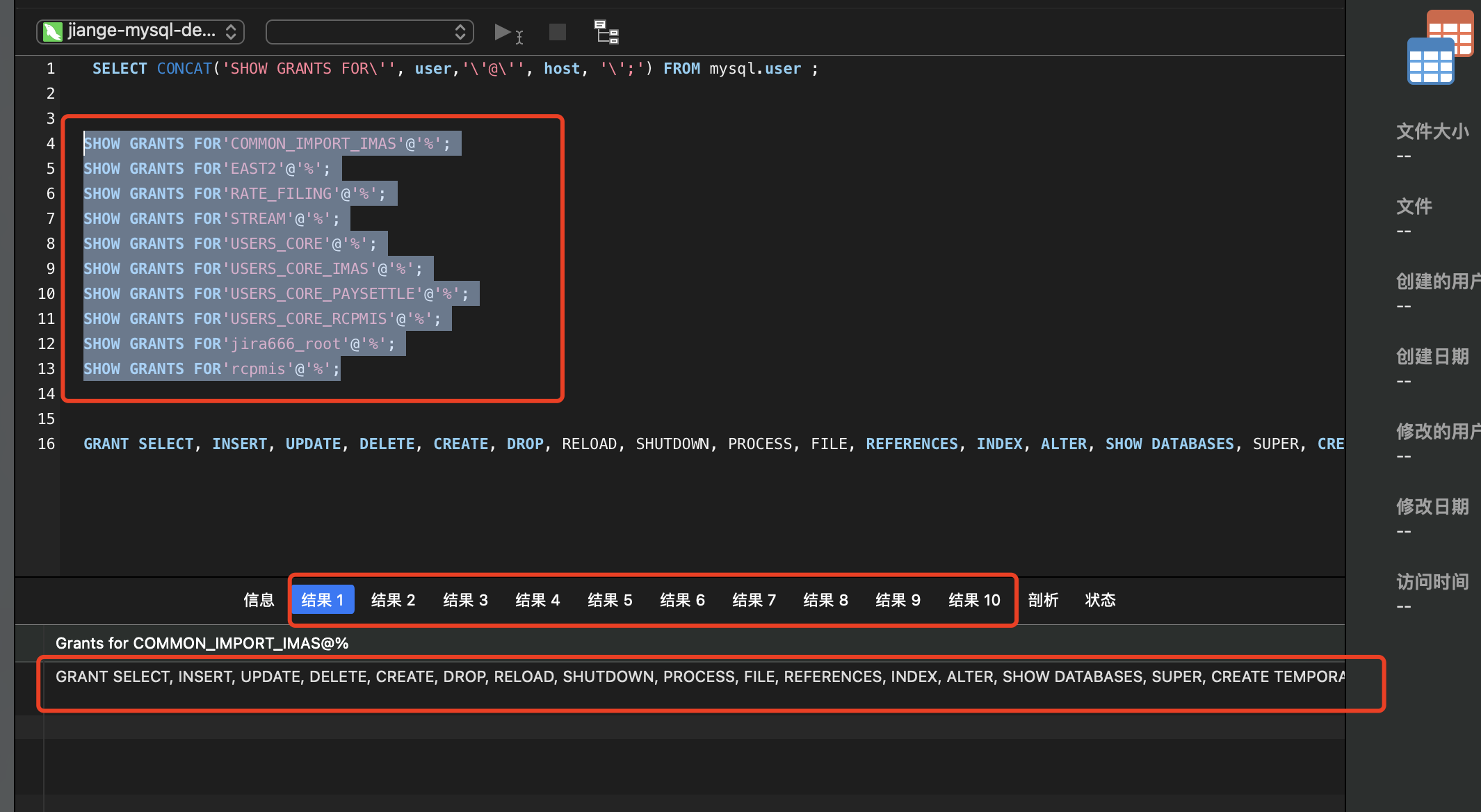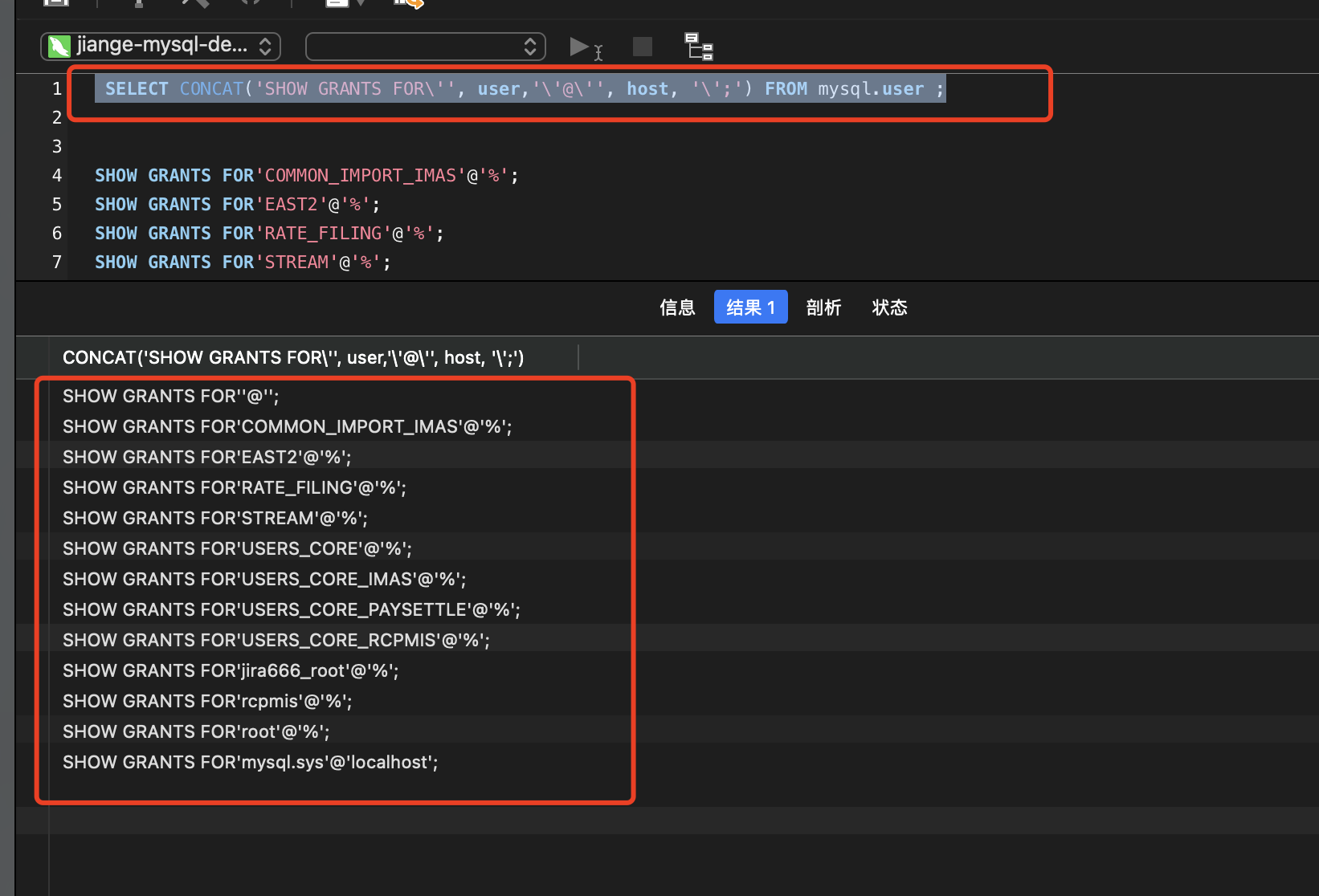 | SELECT CONCAT('SHOW GRANTS FOR\'', user,'\'@\'', host, '\';') FROM mysql.user ; SHOW GRANTS FOR'COMMON_IMPORT_IMAS'@'%'; SHOW GRANTS FOR'EAST2'@'%'; SHOW GRANTS FOR'RATE_FILING'@'%'; SHOW GRANTS FOR'STREAM'@'%'; SHOW GRANTS FOR'USERS_CORE'@'%'; SHOW GRANTS FOR'USERS_CORE_IMAS'@'%'; SHOW GRANTS FOR'USERS_CORE_PAYSETTLE'@'%'; SHOW GRANTS FOR'USERS_CORE_RCPMIS'@'%'; SHOW GRANTS FOR'jira666_root'@'%'; SHOW GRANTS FOR'rcpmis'@'%';