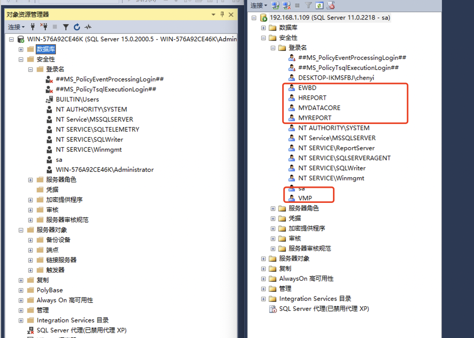 --查看登录名服务器角色 SELECT sp.name AS [login_name] ,CASE WHEN sp.[type]='S' THEN 'SQL 登录名' WHEN sp.[type]='U' THEN 'Windows 登录名' WHEN sp.[type]='G' THEN 'Windows 组' WHEN sp.[type]='R' THEN '服务器角色' WHEN sp.[type]='C' THEN '映射到证书的登录名' WHEN sp.[type]='K' THEN '映射到非对称密钥的登录名' END AS [principal_type] ,sp.is_disabled ,ISNULL(sp.default_database_name,'') as [default_database_name] ,ISNULL(rsp.name,'') AS [server_role] ,STUFF((SELECT ','+permission_name FROM sys.server_permissions spp where sp.principal_id=spp.grantee_principal_id for xml path('')),1,1,'') as [permissions] FROM sys.server_principals sp LEFT JOIN sys.server_role_members srm ON sp.principal_id=srm.member_principal_id LEFT JOIN sys.server_principals rsp ON srm.role_principal_id=rsp.principal_id where rsp.name is not null ORDER BY [principal_type],sp.principal_id --授权服务器角色 select N'EXEC sp_addsrvrolemember N''' +sp.name+ ''' ,N''' + rsp.name+''' ' FROM sys.server_principals sp LEFT JOIN sys.server_role_members srm ON sp.principal_id=srm.member_principal_id LEFT JOIN sys.server_principals rsp ON srm.role_principal_id=rsp.principal_id where rsp.name is not null