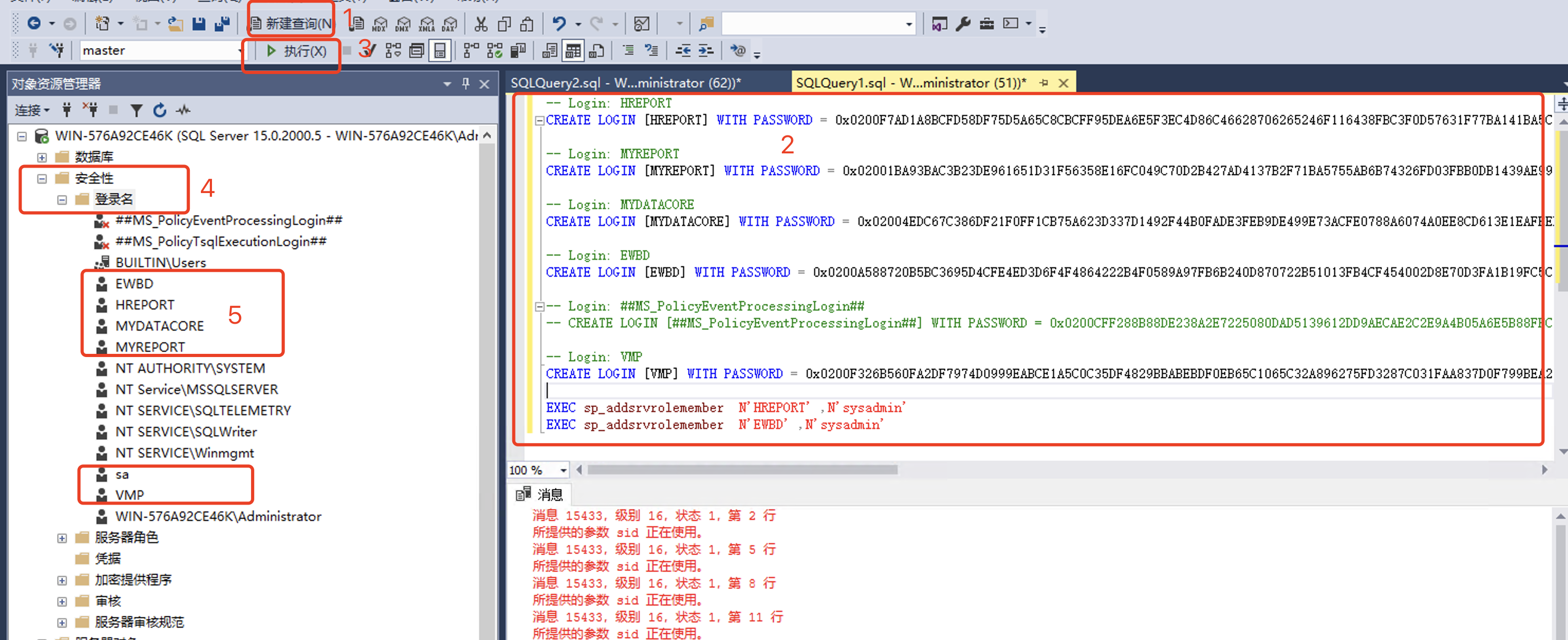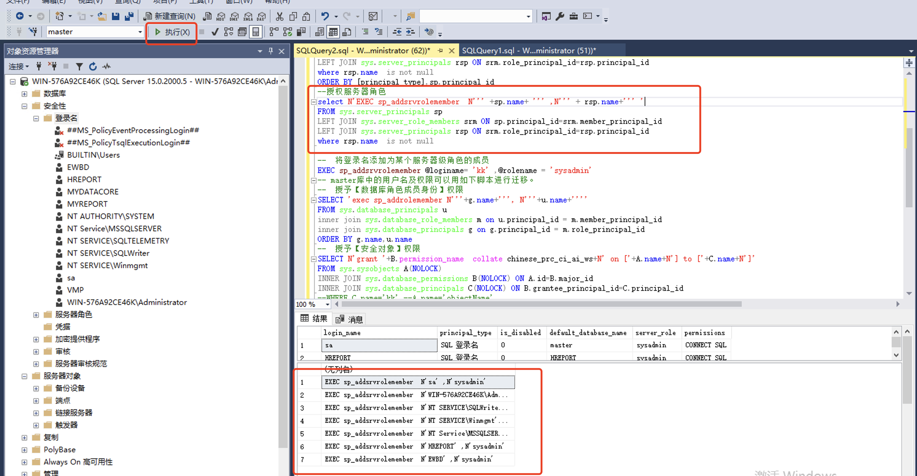 -- 将登录名添加为某个服务器级角色的成员 EXEC sp_addsrvrolemember @loginame= 'kk' ,@rolename = 'sysadmin' -- master库中的用户名及权限可以用如下脚本进行迁移。 -- 授予【数据库角色成员身份】权限 SELECT 'exec sp_addrolemember N'''+g.name+''', N'''+u.name+'''' FROM sys.database_principals u inner join sys.database_role_members m on u.principal_id = m.member_principal_id inner join sys.database_principals g on g.principal_id = m.role_principal_id ORDER BY g.name,u.name -- 授予【安全对象】权限 SELECT N'grant '+B.permission_name collate chinese_prc_ci_ai_ws+N' on ['+A.name+N'] to ['+C.name+N']' FROM sys.sysobjects A(NOLOCK) INNER JOIN sys.database_permissions B(NOLOCK) ON A.id=B.major_id INNER JOIN sys.database_principals C(NOLOCK) ON B.grantee_principal_id=C.principal_id --WHERE C.name='kk' --A.name='objectName'