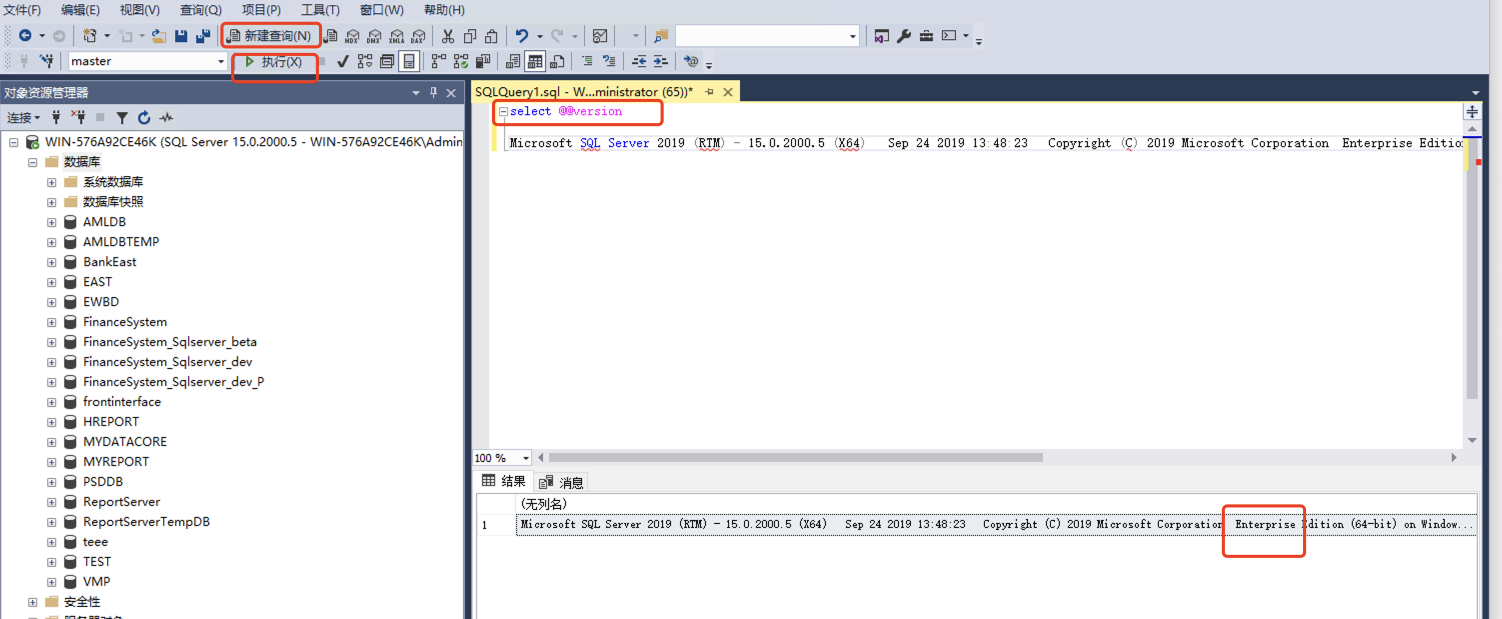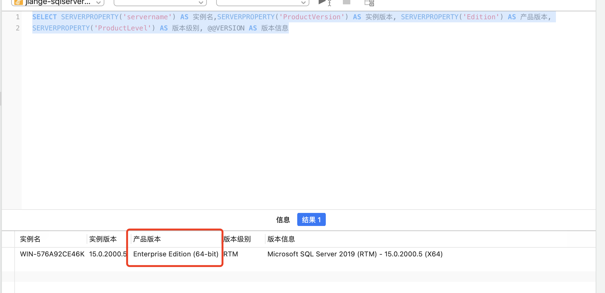 SELECT SERVERPROPERTY('servername') AS 实例名,SERVERPROPERTY('ProductVersion') AS 实例版本, SERVERPROPERTY('Edition') AS 产品版本, SERVERPROPERTY('ProductLevel') AS 版本级别, @@VERSION AS 版本信息