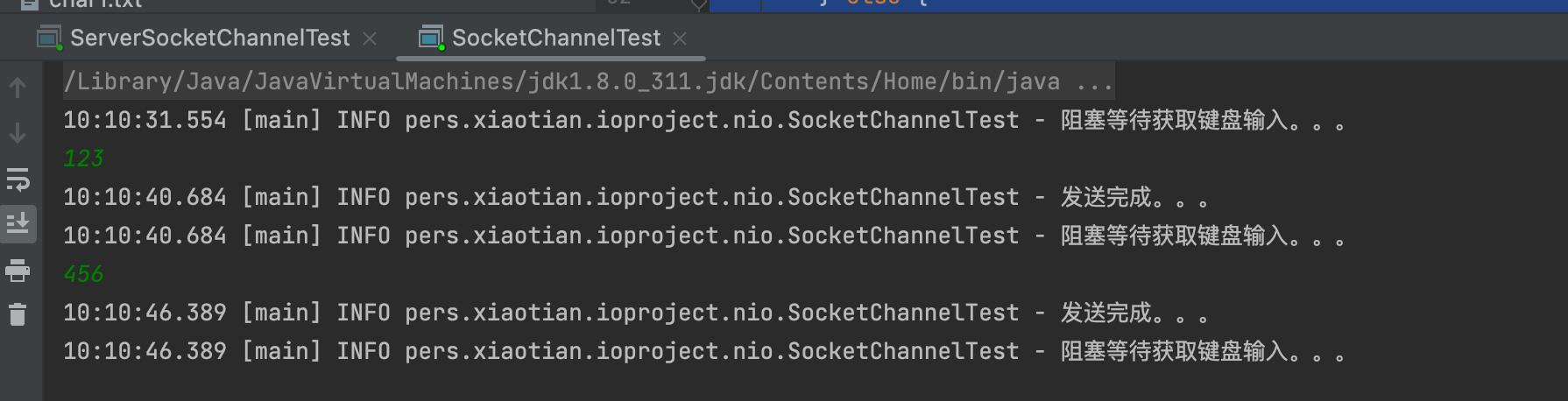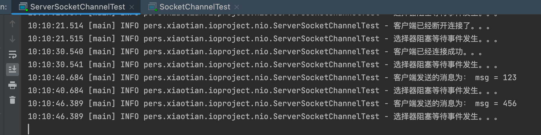 @Slf4j public class SocketChannelTest { public static void main(String[] args) throws IOException, InterruptedException { SocketChannel socketChannel = SocketChannel.open(); socketChannel.configureBlocking(false); Selector selector = Selector.open(); socketChannel.register(selector, SelectionKey.OP_CONNECT); socketChannel.connect(new InetSocketAddress(6666)); Thread.sleep(1000); if (socketChannel.finishConnect()) { while(true) { log.info("阻塞等待获取键盘输入。。。"); Scanner scanner = new Scanner(System.in); if (scanner.hasNext()) { String msg = scanner.next(); socketChannel.register(selector, SelectionKey.OP_READ);