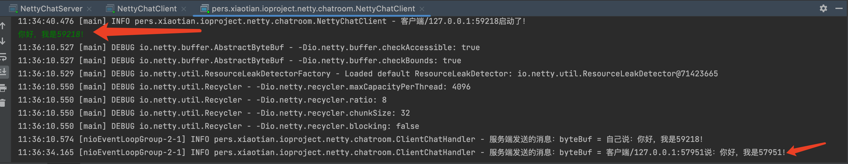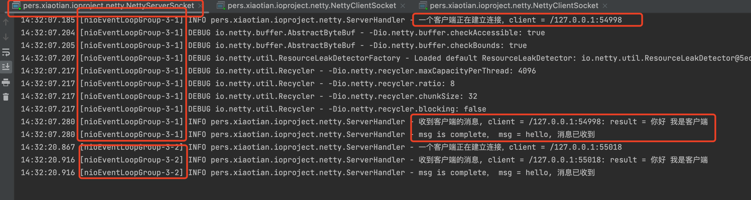 启动多个客户端,观察服务端接收结果,如图: