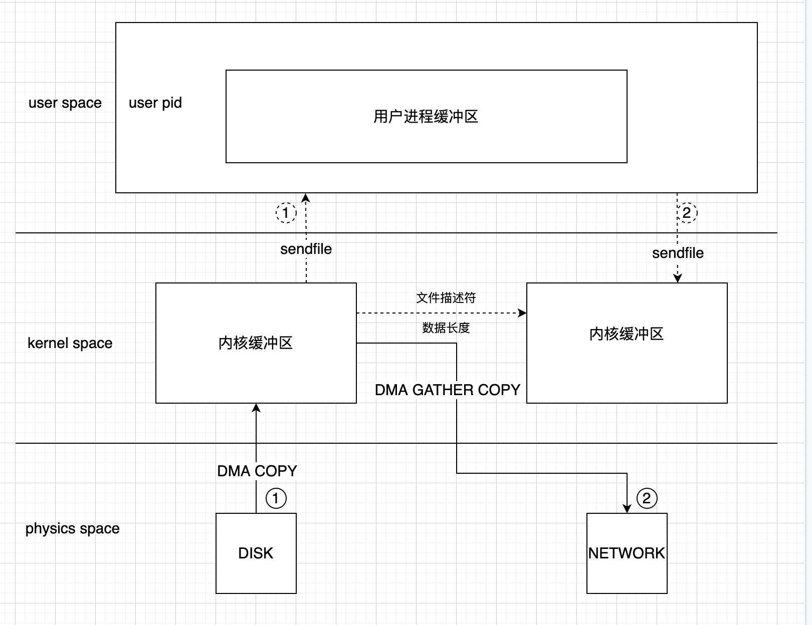 linux 2.1时,通过sendfile技术减少了两次用户态与内核态之间的切换.如图:
