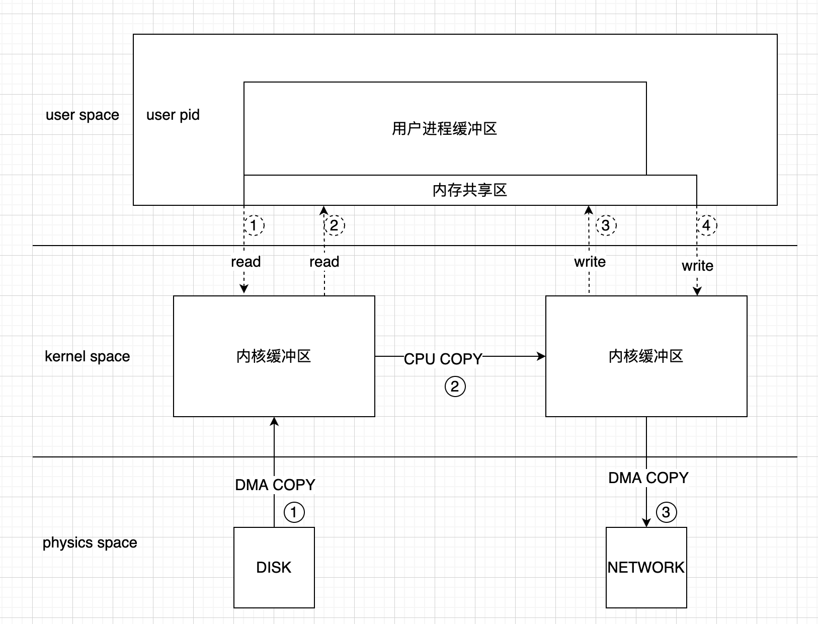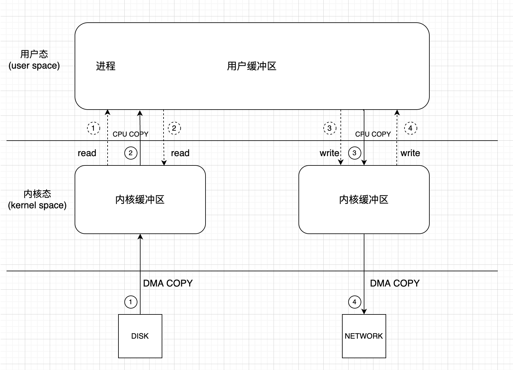 数据传输会从硬盘通过DMA拷贝到内核态(kernel state),内核态数据经过CPU拷贝到用户态(user state),然后用户态的数据经过CPU拷贝到内核态,内核态的数据又经过DMA拷贝到网卡或者目标磁盘位置.这样就经过了四次拷贝以及四次状态的切换(每次CPU拷贝都会有相应的读入和写出的切换).如下图所示: