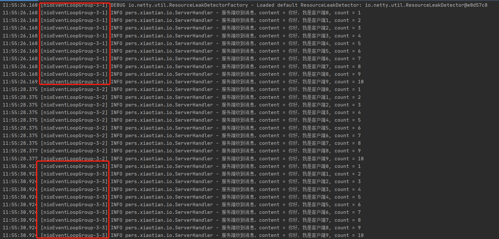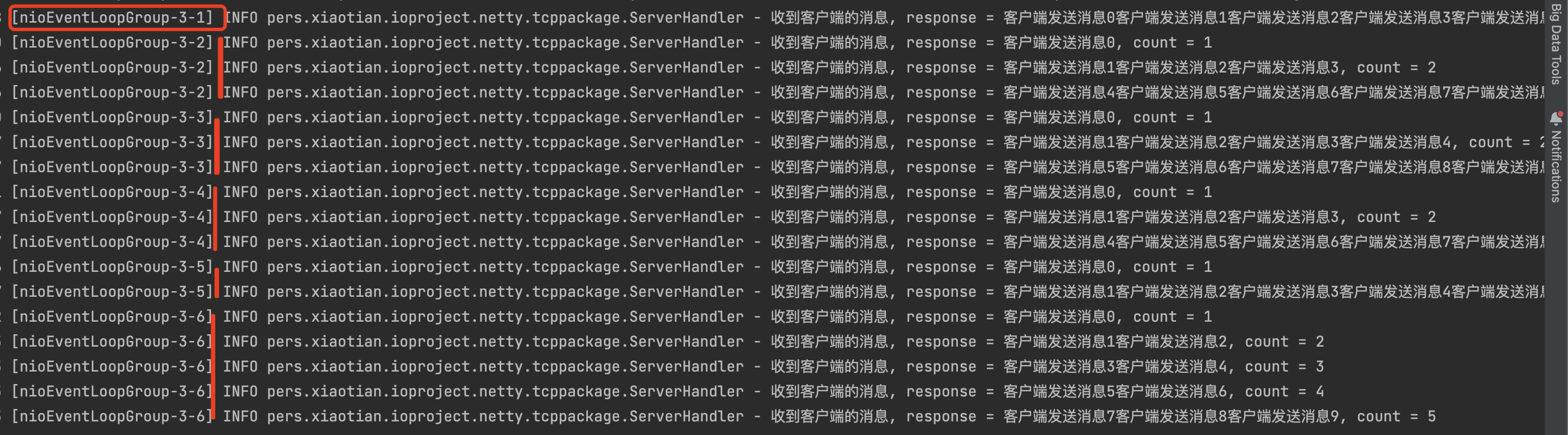 @Override public void channelRead(ChannelHandlerContext ctx, Object msg) throws Exception { MyProtocol myProtocol = (MyProtocol) msg; String content = new String(myProtocol.getContent(), CharsetUtil.UTF_8); log.info("服务端收到消息,content = {}, count = {}", content, ++count); } }