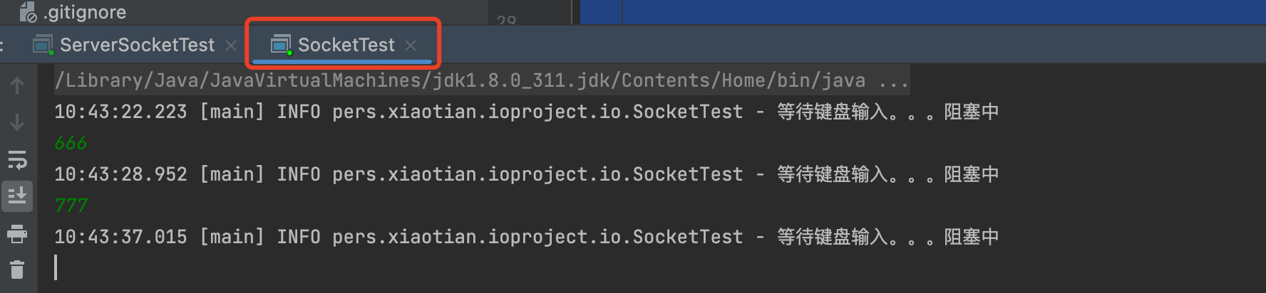 @Slf4j public class SocketTest { public static void main(String[] args) throws IOException { //创建一个Socket客户端,绑定SocketServer信息 Socket socket = new Socket("127.0.0.1", 6666); //获取socket的输出流 OutputStream socketOutputStream = socket.getOutputStream(); //创建键盘绑定事件 Scanner scanner = new Scanner(System.in); while (true) { log.info("等待键盘输入。。。阻塞中"); //等待键盘输入 if (scanner.hasNext()) { //取出键盘输入的字符串信息 String inputStr = scanner.next(); //将字符串信息写入到socket输出流中 socketOutputStream.write(inputStr.getBytes()); } }
