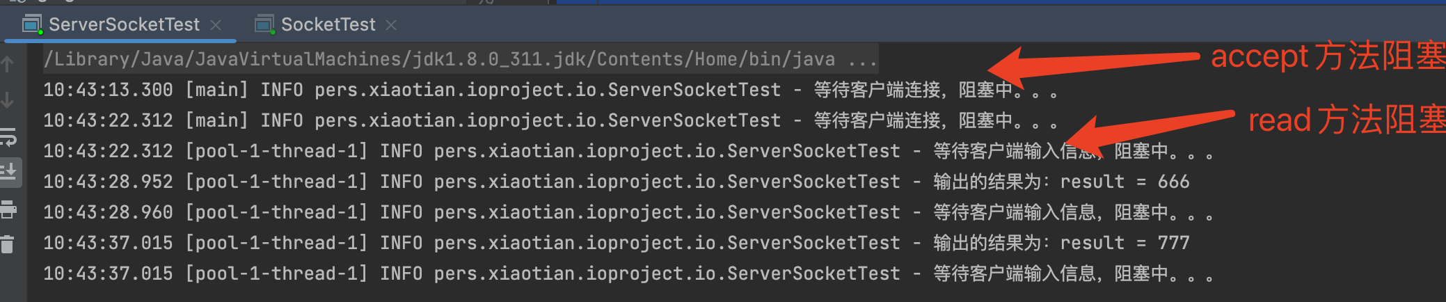 1.存在两处阻塞问题:一个是等待连接阻塞,另外一个socket流中等待输入的阻塞.